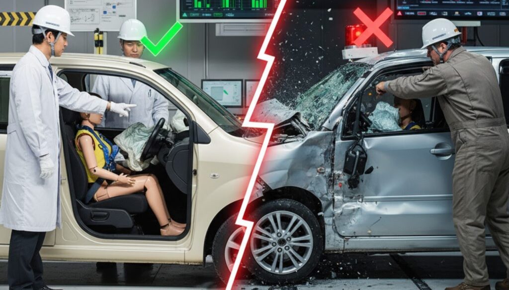 一方、アメリカの安全基準(NHTSA)は、日本(NASVA)の試験と比較して、衝突時の車体の保持状況も重視しています。外部からの衝撃に弱い軽自動車の規格では、アメリカの厳しい安全基準を満たすことが難しいとされています。